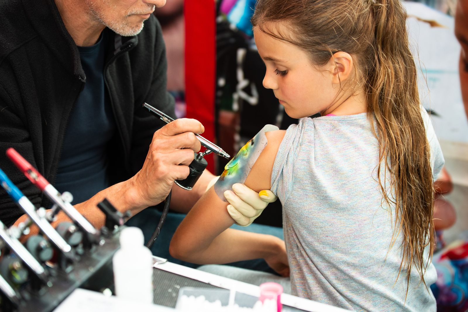 Wanneer families foto’s maken, ontstaat er plots een lege stoel bij de airbrush, en vijf minuten later een stormloop.
